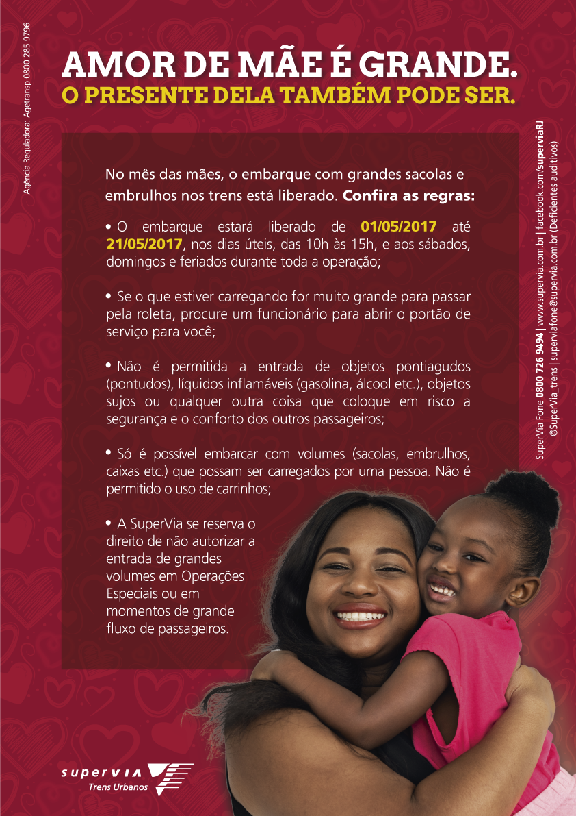 O Dia das Mães está chegando e, nessa época, os passageiros do trem do Rio costumam carregar sacolas e presentes volumosos. Pensando nisso, o embarque com grandes volumes está liberado entre 1/05 e 21/05.